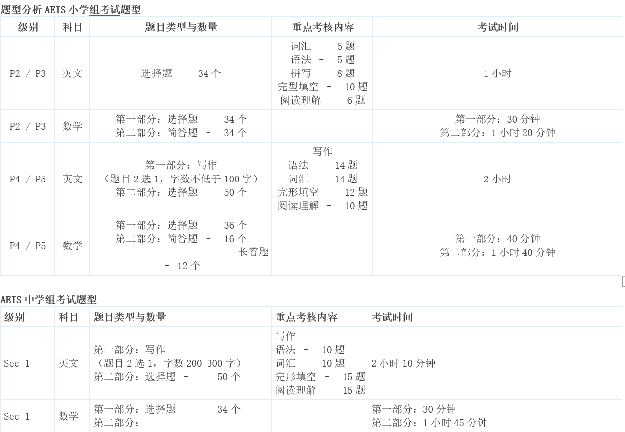 AEIS考试主要考察两个科目:英语和数学。考试们是否入学主要取决于: